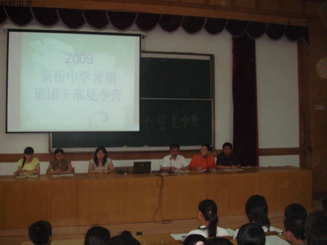 2009年7月29日上午9时,常州市新桥中学暑期班团干部夏令营在学校阶梯教室准时开营。政教处潘建明、刘猛两位主任及校团委老师出席了本次开营仪式。