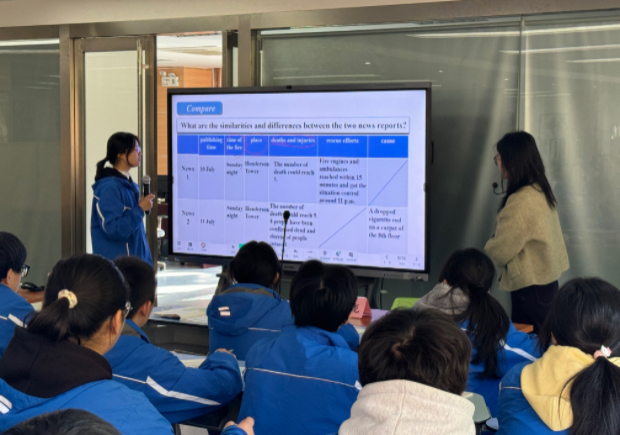 新桥高级中学丁明明老师以英语学习活动观为指导,成功呈现了一节高水平阅读课。授课中,丁老师以选择性必修二Unit 1 Reading Be a critical news reader为教学载体,精心选取生活中常见的新闻素材设计导入环节与输出任务,有效激活学生已有知识储备。课堂上,丁老师引导学生对两篇新闻稿展开对比分析,在此基础上启发学生发现问题,自然过渡至第三篇文本的学习。教学过程围绕“总结问题成因、掌握成为批判性读者的方法”展开,从文章结构、核心内容到深层思维引导,层层递进、逻辑清晰。同时,丁老师始终秉持以学生为中心的教学理念,在各教学环节中均设计了丰富的学生参与式活动,充分调动学生主动性。