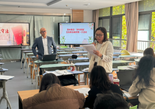 为加强联盟校间的教学经验交流,提升教师专业素养与课堂教学质量,2025年11月13日,新桥高级中学成功举办高中英语“学科联盟〞五校联合教研第一次活动。来自联盟校的骨干教师齐聚一堂,常州市教科院宋德龙老师应邀莅临指导,全体教师通过课堂展示、评课研讨等形式,共同探索英语学科教学新路径。