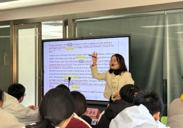 随后,龙城高级中学郭皓老师带来一节以“定语从句在写作中的运用”为核心目标的语法课。本节课以功能实用化、主题情境化为设计理念,采用逆向教学设计思路。郭老师首先明确课堂产出目标——完成一篇关于“世界睡眠日”的微演讲,随后依托语篇带领学生探索定语从句中关系副词的运用规则,并通过选词游戏、填空练习、句式改写等多样化活动强化知识掌握。值得关注的是,所有强化训练任务均与最终写作任务紧密关联,助力学生在课程结束时能运用所学完成写作任务。整堂课以真实情境为依托、以任务驱动为导向,将语法知识转化为解决实际写作问题的工具,高效实现了“教学评一体化”的教学目标。